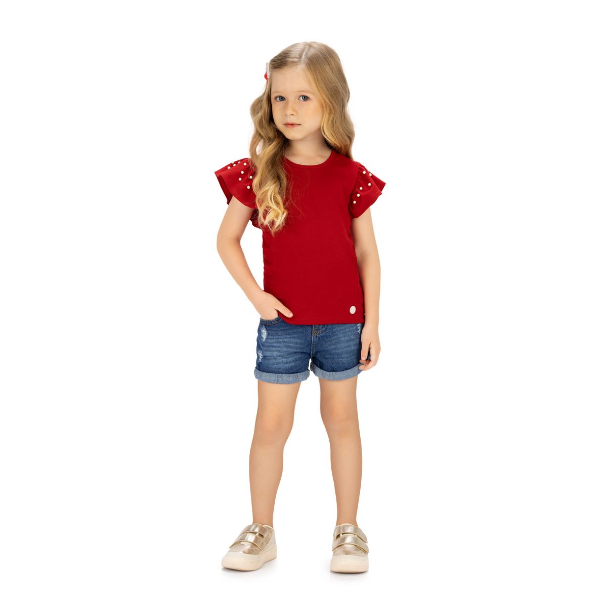 A aplicação de pérolas na parte frontal adiciona um toque elegante na medida certa, deixando a peça especial para momentos em família, passeios e eventos.