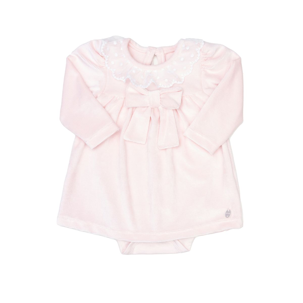 O Body Vestido em Algodão Plush Canelado une a praticidade do body com a delicadeza de um vestido, criando um visual encantador e confortável para a sua bebê.
