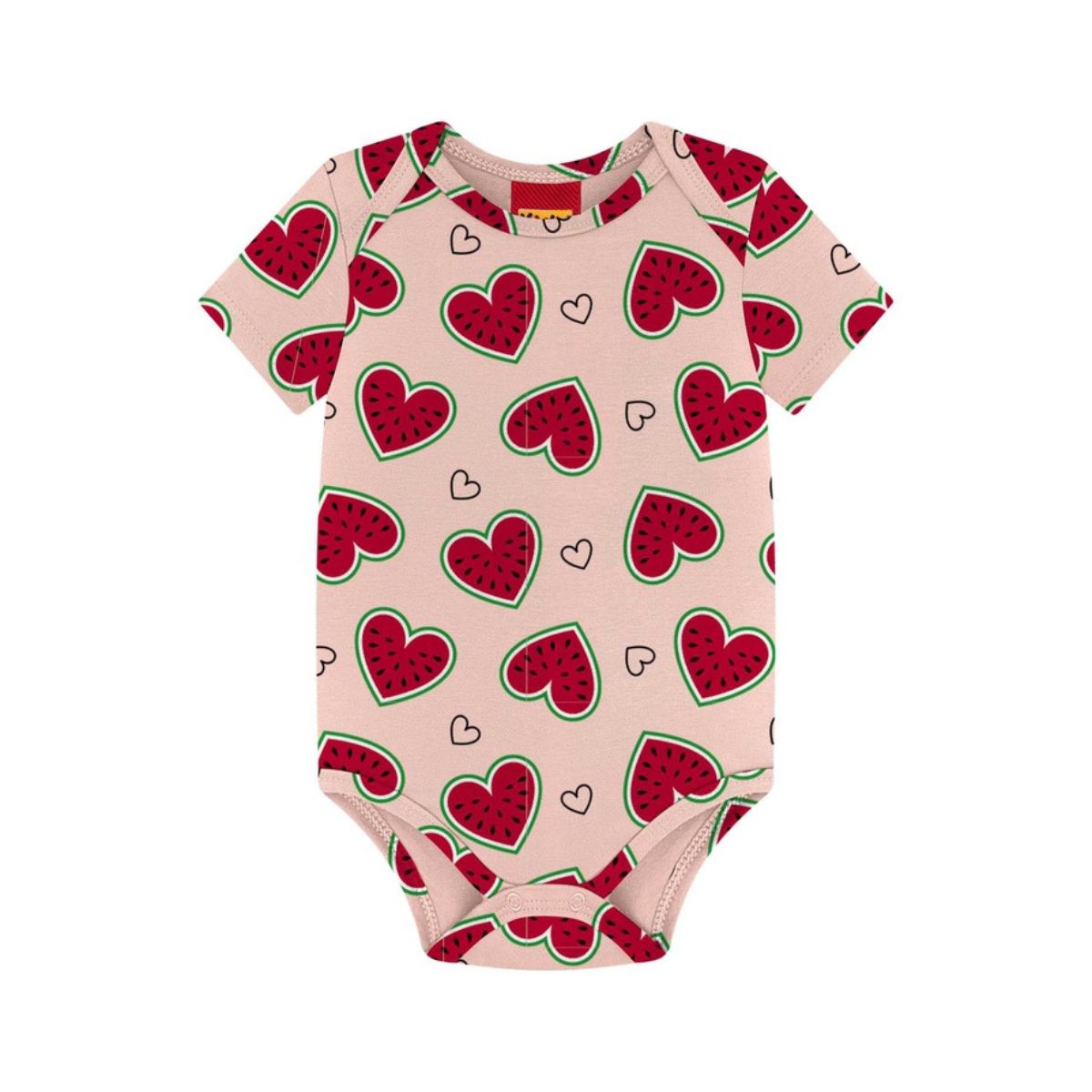 Doçura e diversão em uma única peça! O Body Bebê Manga Curta Estampa Melancia Coração é perfeito para deixar o visual do seu pequeno ainda mais encantador.