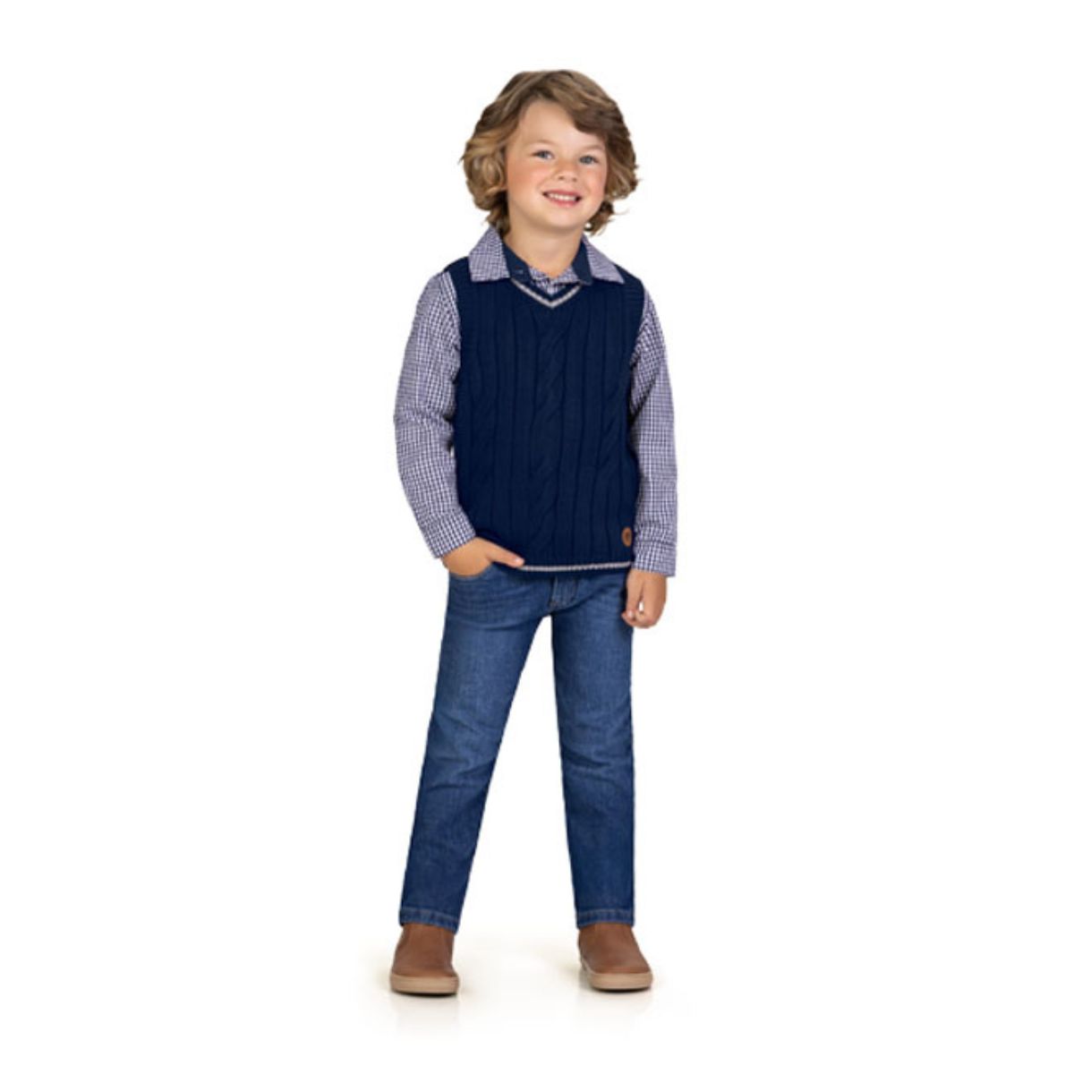 Se você procura uma roupa infantil elegante, confortável e versátil, o colete em tricot azul marinho é uma excelente escolha para deixar os meninos ainda mais estilosos.