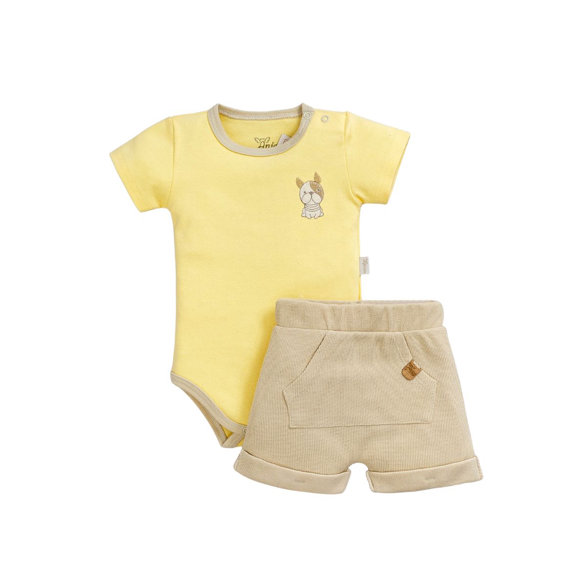 O body em malha tricot possui textura diferenciada, toque macio e acabamento impecável, ideal para manter o bebê bem vestido em dias mais quentes. Já o shorts de tricot com cós confortável completa o look com praticidade, oferecendo liberdade de movimento sem abrir mão do charme. O tom amarelo vivo traz alegria e personalidade à produção.