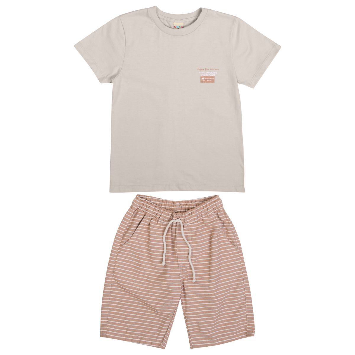 A camiseta bege é confeccionada em meia malha macia e respirável, ideal para os dias mais quentes. A bermuda listrada em tecido eco tem visual leve, toque suave e cós com elástico e cordão ajustável — perfeita para garantir liberdade nos movimentos.