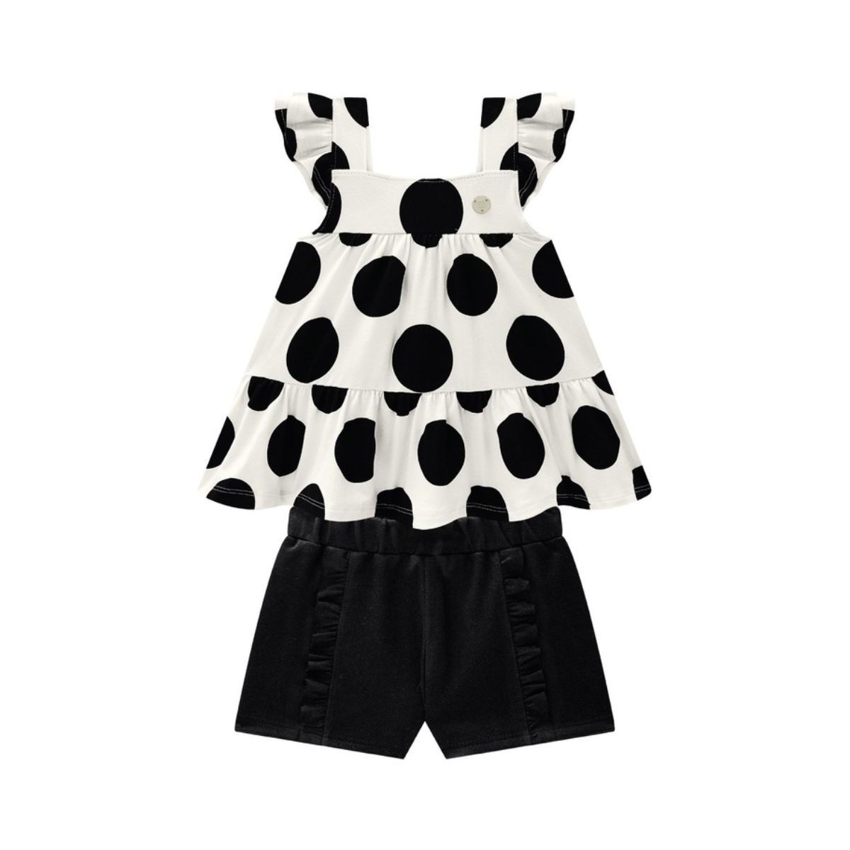 Conjunto Infantil Poás Preto e Branco é a escolha perfeita para deixar sua pequena ainda mais charmosa. A blusa apresenta estampa moderna de poás, com modelagem soltinha, babadinhos delicados e alças com detalhe franzido, garantindo um visual alegre e estiloso.