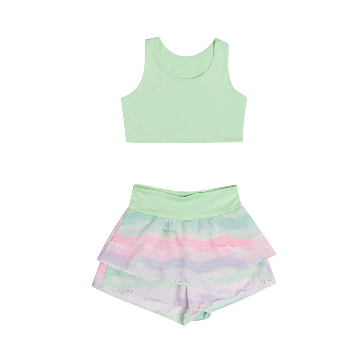 O Conjunto Fit Shine Infantil BB Chic é perfeito para meninas cheias de energia e estilo. Composto por top com proteção UV 50+ e shorts saia em tecido sublimado, o conjunto oferece conforto, leveza e liberdade para brincar, dançar e se movimentar.