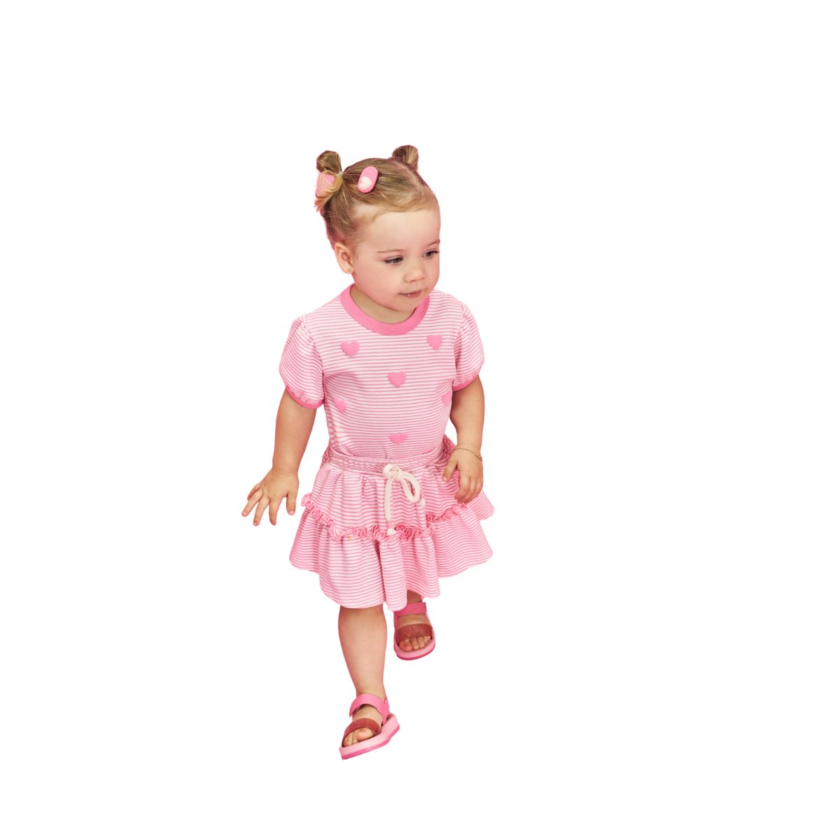 O Conjunto Infantil Rosa com Corações é a escolha perfeita para deixar o dia das meninas ainda mais delicado e confortável. Produzido em malha macia e respirável, ele acompanha: