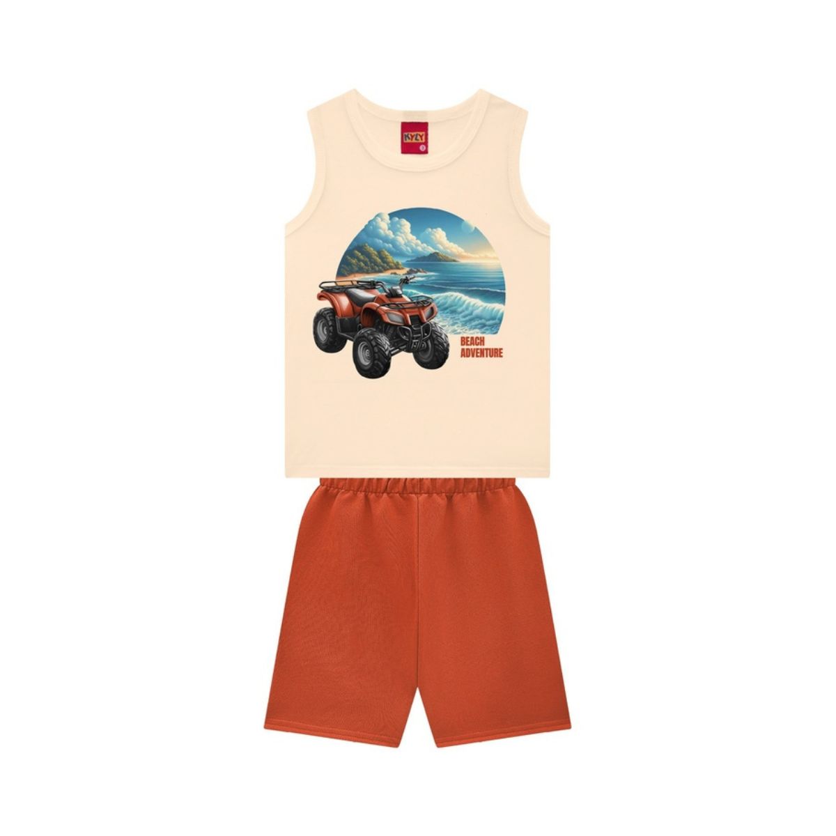 A regata bege traz uma estampa divertida de quadriciclo com cenário de praia, despertando o espírito aventureiro das crianças. A bermuda telha complementa o visual com um toque moderno e cheio de estilo.