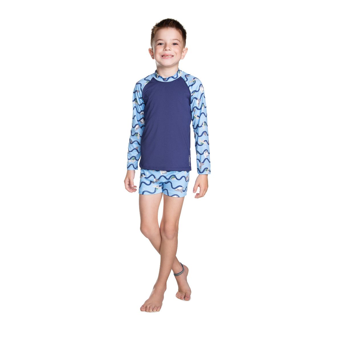 Confeccionada em malha com proteção UV, a peça ajuda a proteger a pele sensível sob a exposição solar, sem abrir mão de maciez e respirabilidade.