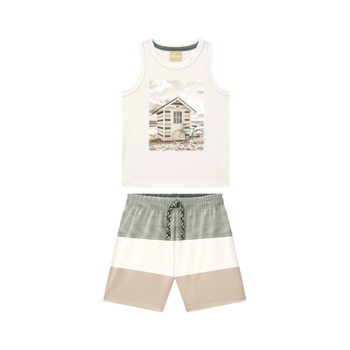 Acompanha bermuda tactel leve e confortável com listras em tons neutros, que além de estilo garante frescor e praticidade para o dia a dia das crianças. Uma combinação perfeita para passeios, férias ou momentos descontraídos.