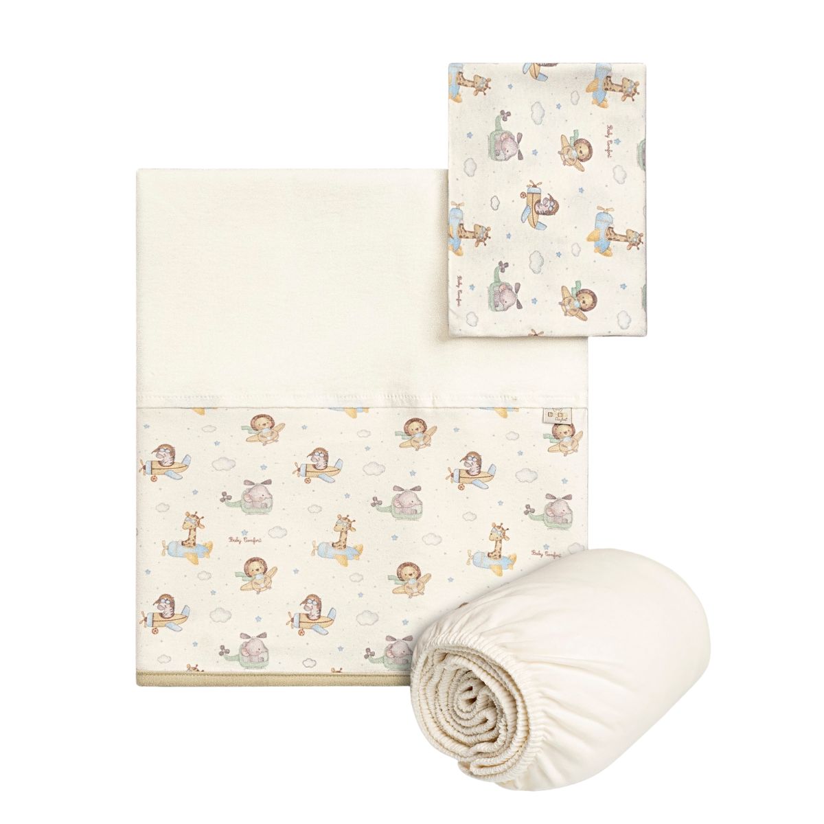 Com estampa lúdica de aviõezinhos e bichinhos em tons neutros, o jogo de lençol une beleza, praticidade e conforto. Fácil de lavar, mantém a maciez mesmo após várias lavagens, sendo perfeito para compor o enxoval do bebê.