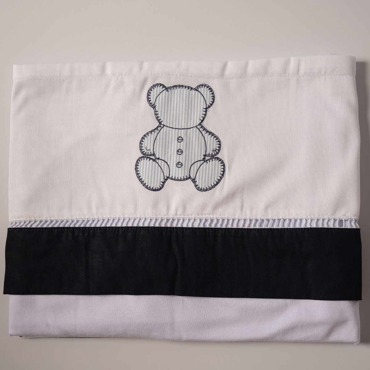 Com um delicado bordado, este conjunto é composto por lençol com elástico, lençol de cima e fronha, adaptando-se ao carrinho com praticidade. É uma opção charmosa para proteger o bebê do contato direto com o estofado e manter o visual sempre encantador.