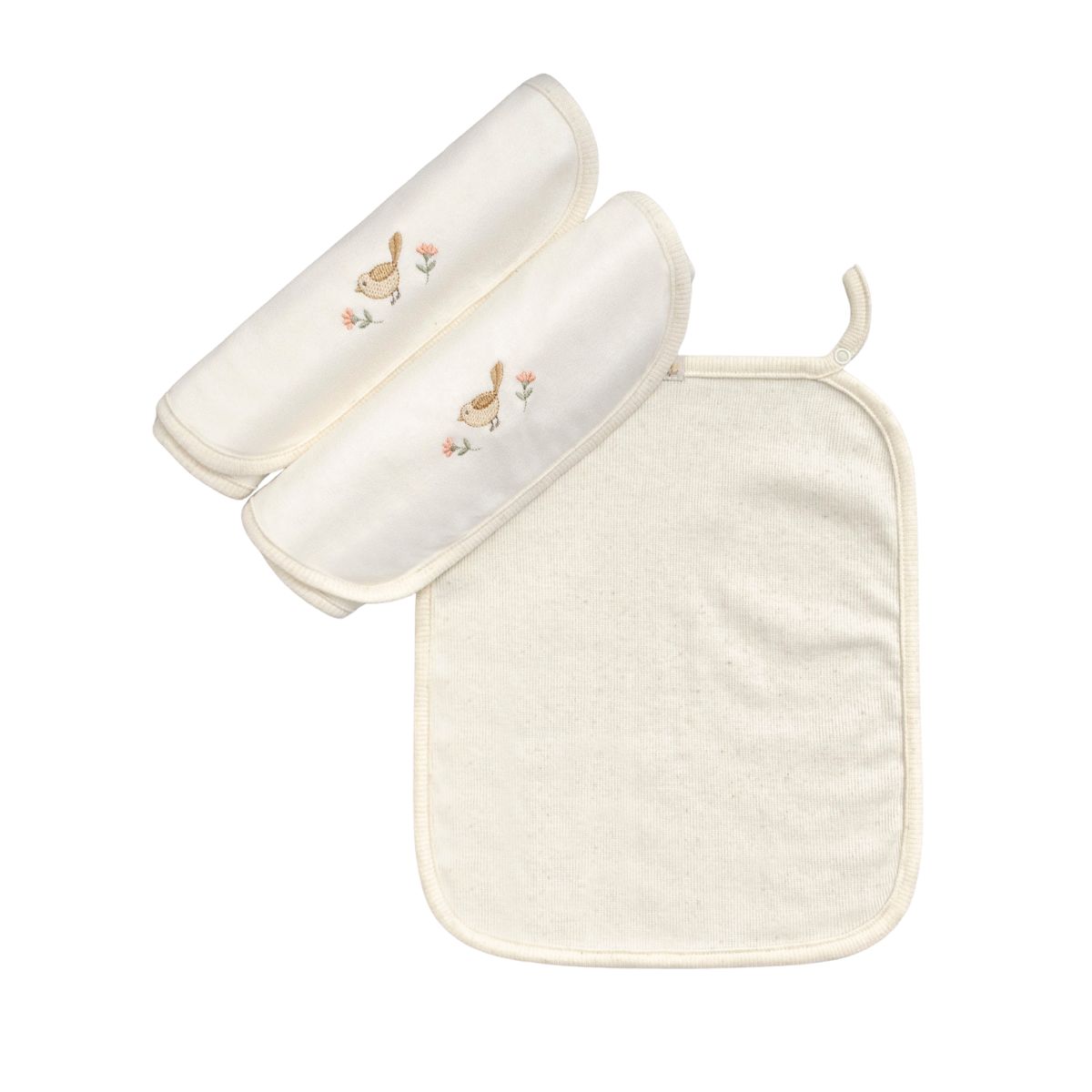 O conjunto vem com três peças: duas babinhas brancas com bordado de passarinho e acabamento off white, além de uma babinha lisa no mesmo tom. Charmosas e funcionais, são indispensáveis para o dia a dia e perfeitas para compor o enxoval do bebê.