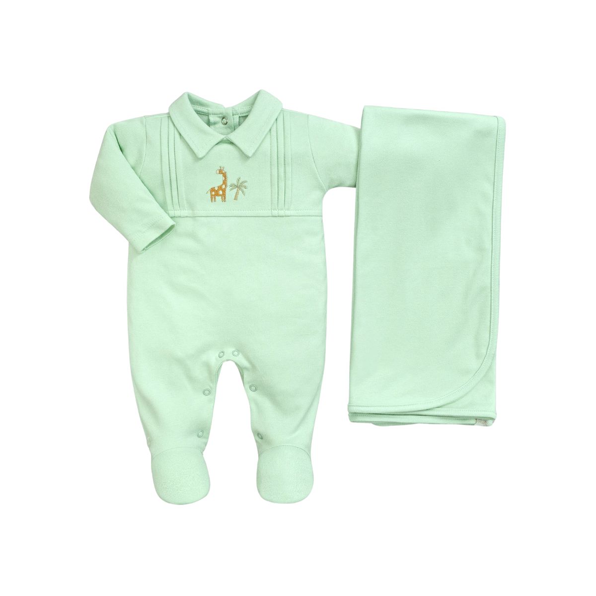 O macacão vem em um tom verde liso e elegante, com bordado de girafinha no peito e nervuras que conferem um acabamento clássico e refinado. Acompanha uma manta combinando para proteger o bebê com suavidade em passeios ou momentos de descanso.
