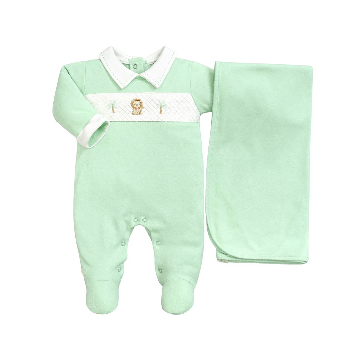 O conjunto é composto por um macacão longo com pezinho, que traz um bordado exclusivo de leãozinho entre palmeiras, cheio de charme e delicadeza. A gola em tom off white com detalhe pespontado adiciona um toque clássico e sofisticado. Acompanha ainda uma manta verde (80x80cm) em algodão pima, ideal para envolver o bebê nos primeiros dias de vida com aconchego e suavidade.