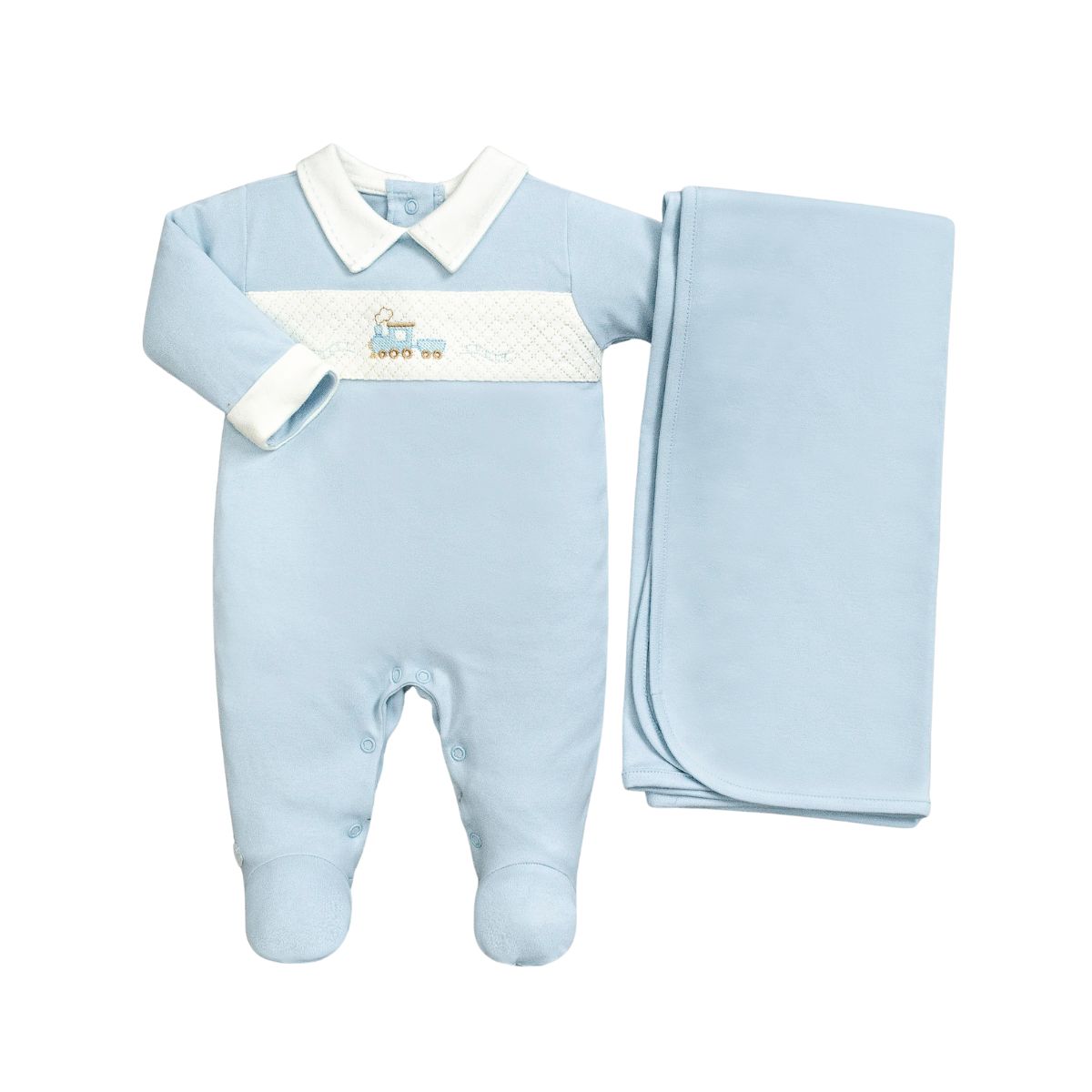 O modelo traz gola e punhos em branco, além de um bordado exclusivo de trenzinho que deixa a peça ainda mais encantadora. Acompanha manta azul no mesmo tecido, formando um conjunto elegante para saída de maternidade ou momentos especiais em família.