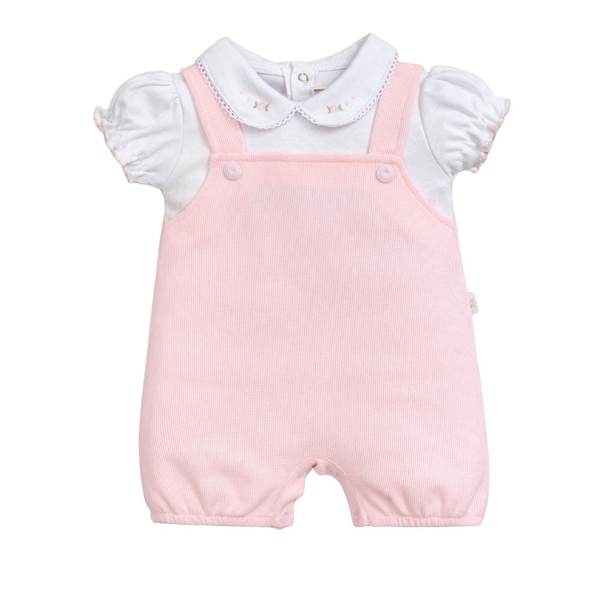 sse macacão estilo jardineira é perfeito para vestir sua bebê com conforto e muito estilo. O design delicado em tom rosa, combinado com a parte superior em branco e gola bordada com detalhes florais, cria um visual romântico e encantador.