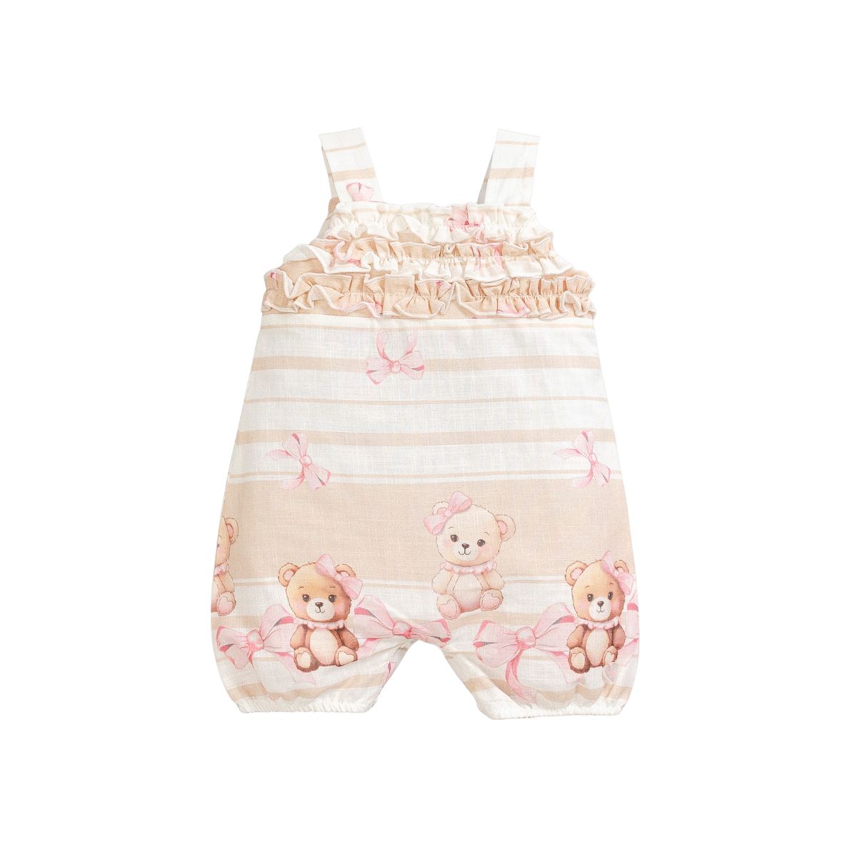 Com estampa exclusiva de ursinhos e laços em tons de rosa e off white, o modelo traz um visual doce e sofisticado ao mesmo tempo. Os babadinhos no busto acrescentam charme e volume suave, valorizando o design clássico que é sinônimo de elegância na moda bebê.