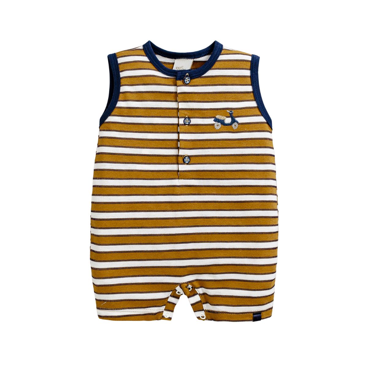 Confeccionado em malha leve e macia, o modelo traz listras em tom mostarda que conferem um ar contemporâneo e charmoso. A modelagem sem mangas (regata) oferece liberdade de movimento, enquanto os botões de pressão no entrepernas facilitam as trocas com praticidade. Um look único, com muita leveza e atitude para o dia a dia do bebê.