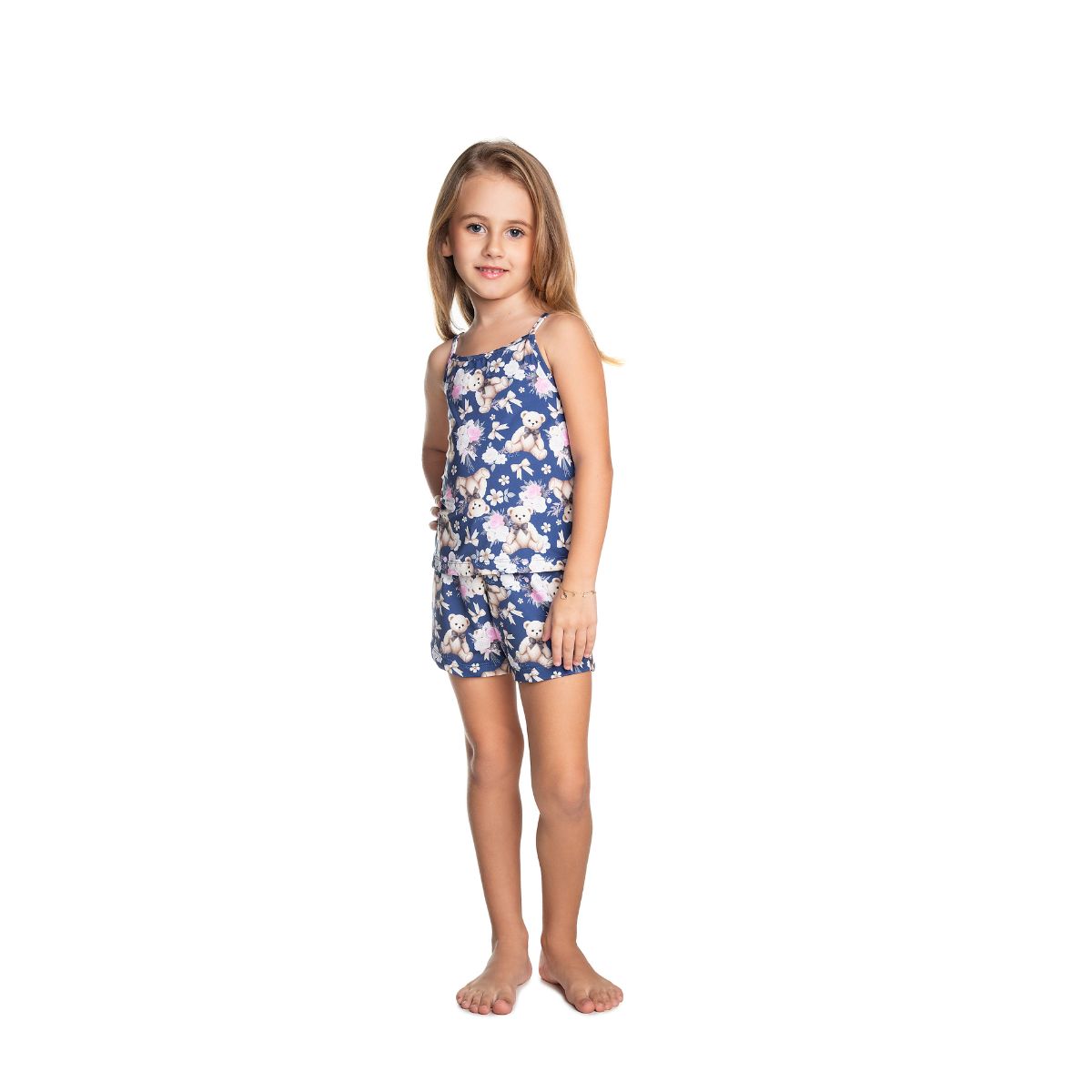 A blusinha possui alcinhas delicadas e estampa encantadora de ursinhos. O short acompanha o mesmo tema, criando um look harmonioso e irresistível.