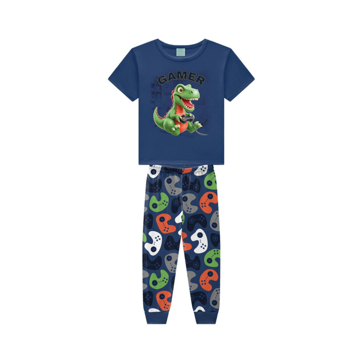 O Pijama Infantil Gamer Dinossauro Azul é pura diversão na hora de dormir! A blusa traz uma estampa supercriativa de dinossauro gamer, perfeita para os pequenos que adoram o mundo dos jogos e da imaginação.
