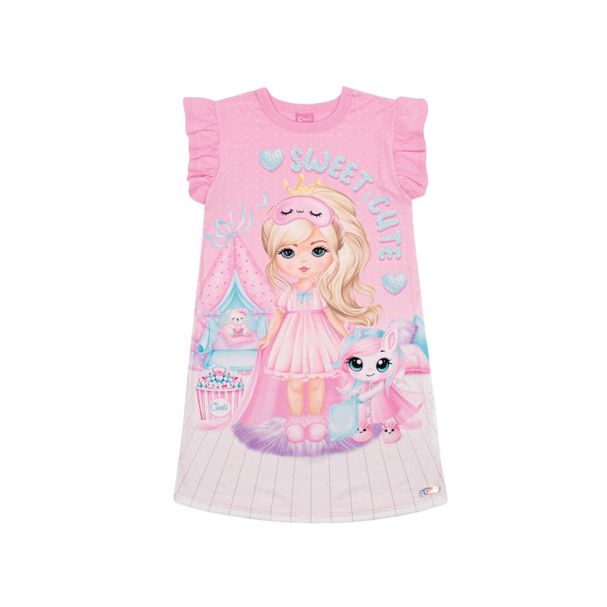Com estampa delicada e lúdica em tons de rosa, a camisola traz um visual doce que transforma a hora de dormir em um momento ainda mais especial. As mangas com leve babado adicionam charme e delicadeza à peça.