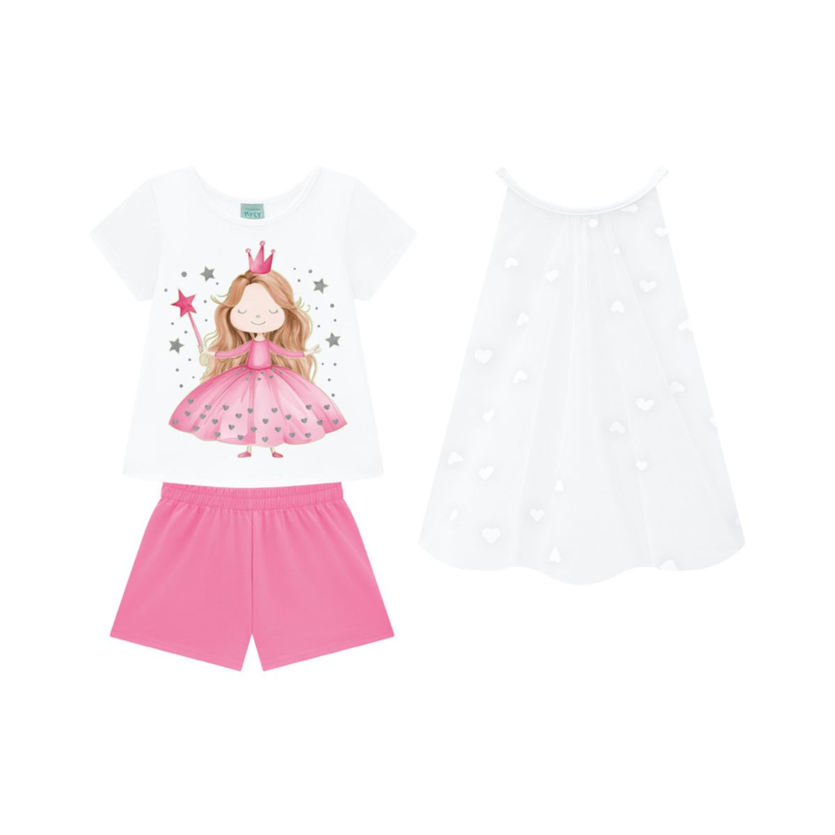 Composto por uma camiseta branca estampada com uma linda princesa, um short rosa confortável e uma capa removível com detalhes de corações, esse conjunto transforma a hora de dormir em um verdadeiro conto de fadas.