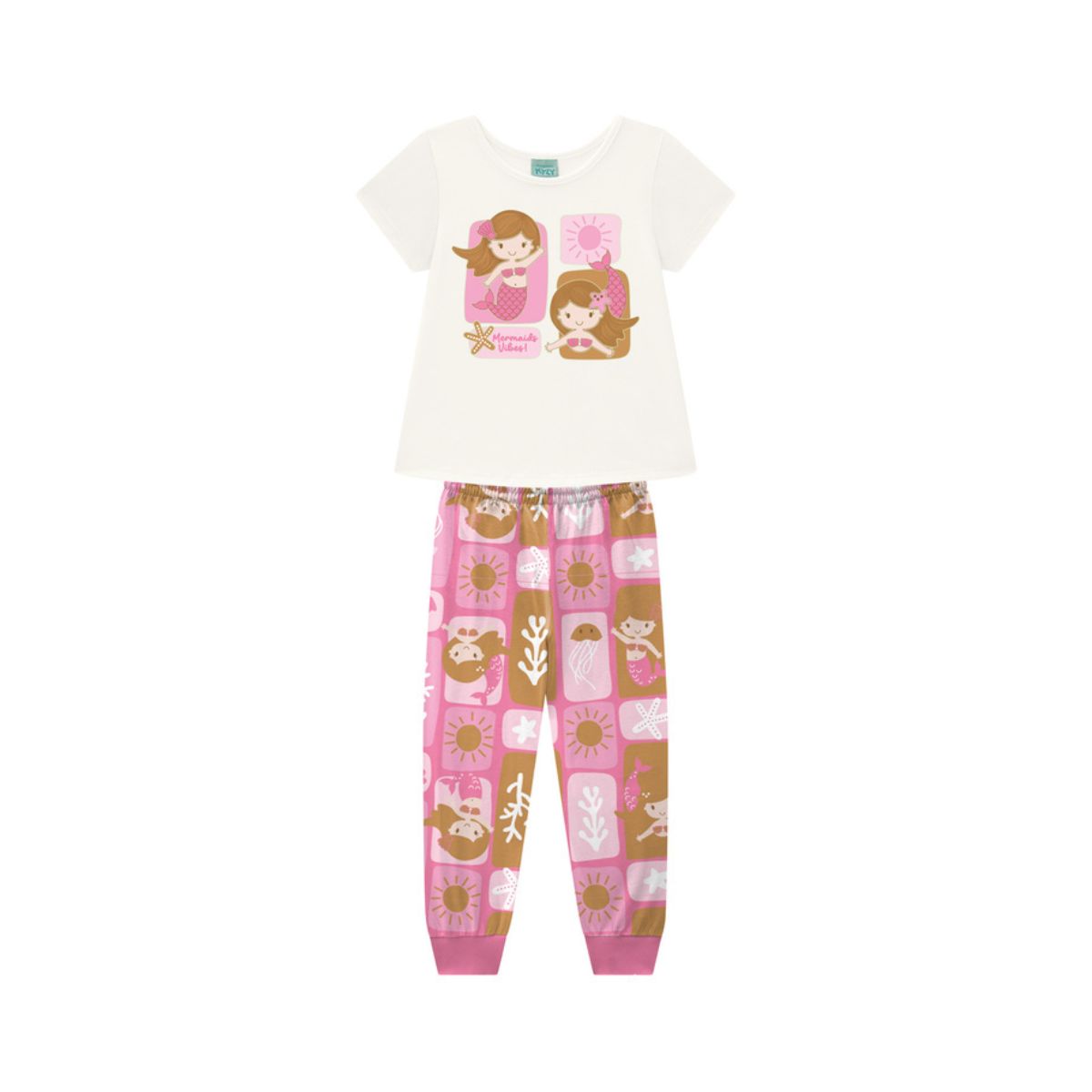 Confeccionado em tecido macio e leve, é perfeito para a meia estação, proporcionando conforto térmico na medida certa. A blusa off white traz um toque delicado e combina perfeitamente com a calça estampada de sereia rosa, cheia de encanto e estilo.