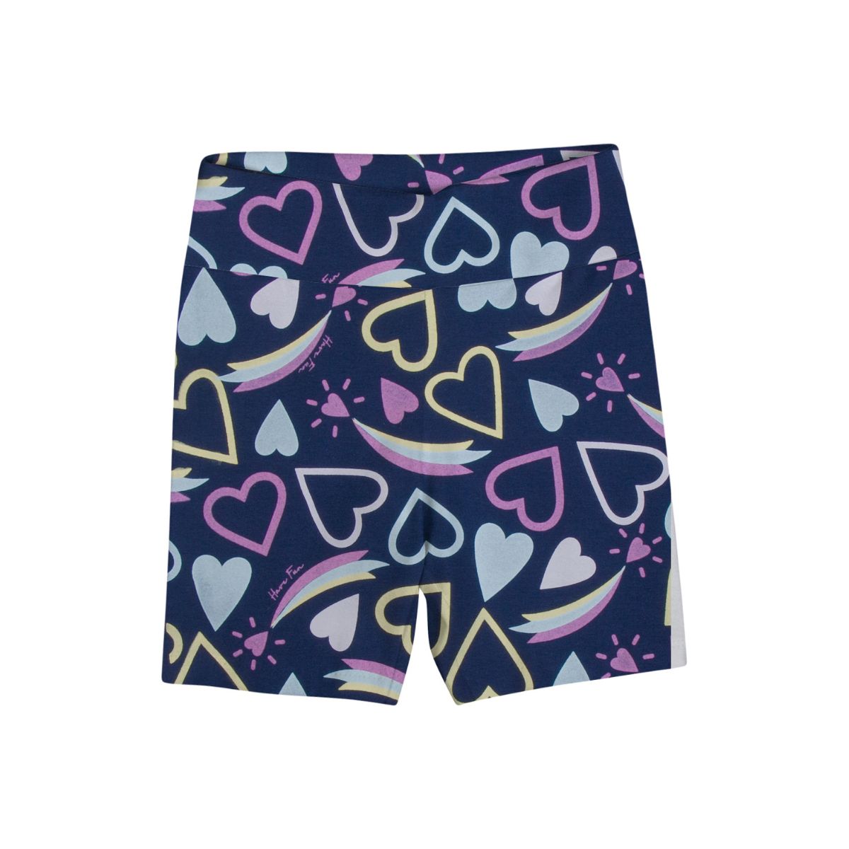 A estampa divertida com corações e arco-íris sobre o fundo azul marinho traz alegria ao visual e combina com blusas básicas, regatinhas e camisetas coloridas. É uma peça curinga para os dias mais quentes, seja em casa, no passeio ou na escola.