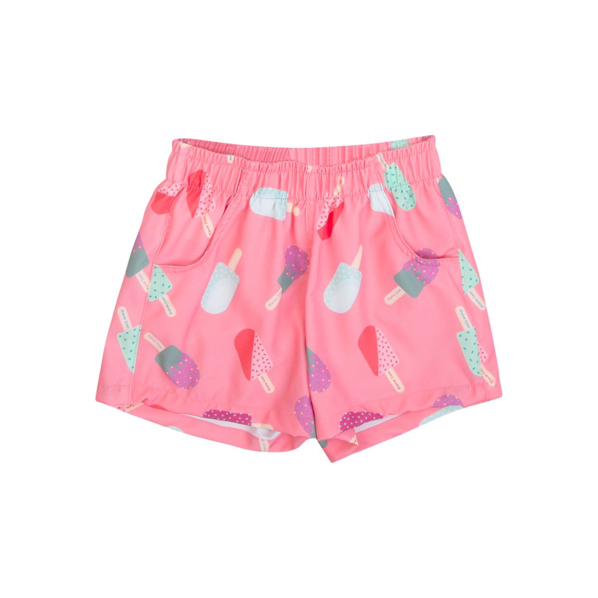 A modelagem confortável e o elástico no cós com cordão regulador garantem ajuste perfeito, enquanto a estampa de picolé traz um visual moderno, divertido e cheio de personalidade. A cor rosa suave combina com diversos looks e traz aquele toque delicado que as meninas adoram.