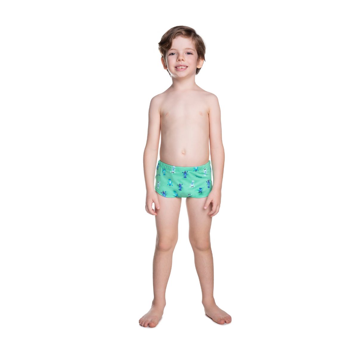 A sunga tradicional em malha com proteção é ideal para acompanhar os pequenos nos dias de sol, oferecendo conforto, secagem rápida e liberdade de movimentos.