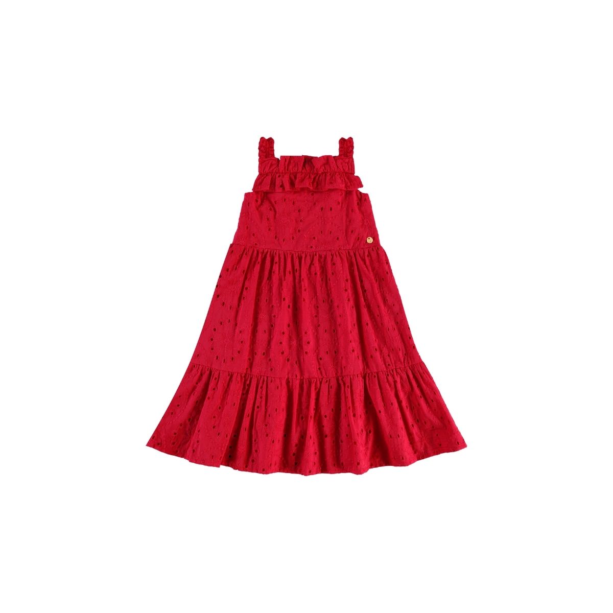 Com modelagem soltinha e alças delicadas, o vestido proporciona liberdade de movimentos, sendo ideal tanto para passeios quanto para eventos especiais. O tom vermelho vibrante transmite alegria e elegância, tornando a peça um destaque no guarda-roupa da sua menina.
