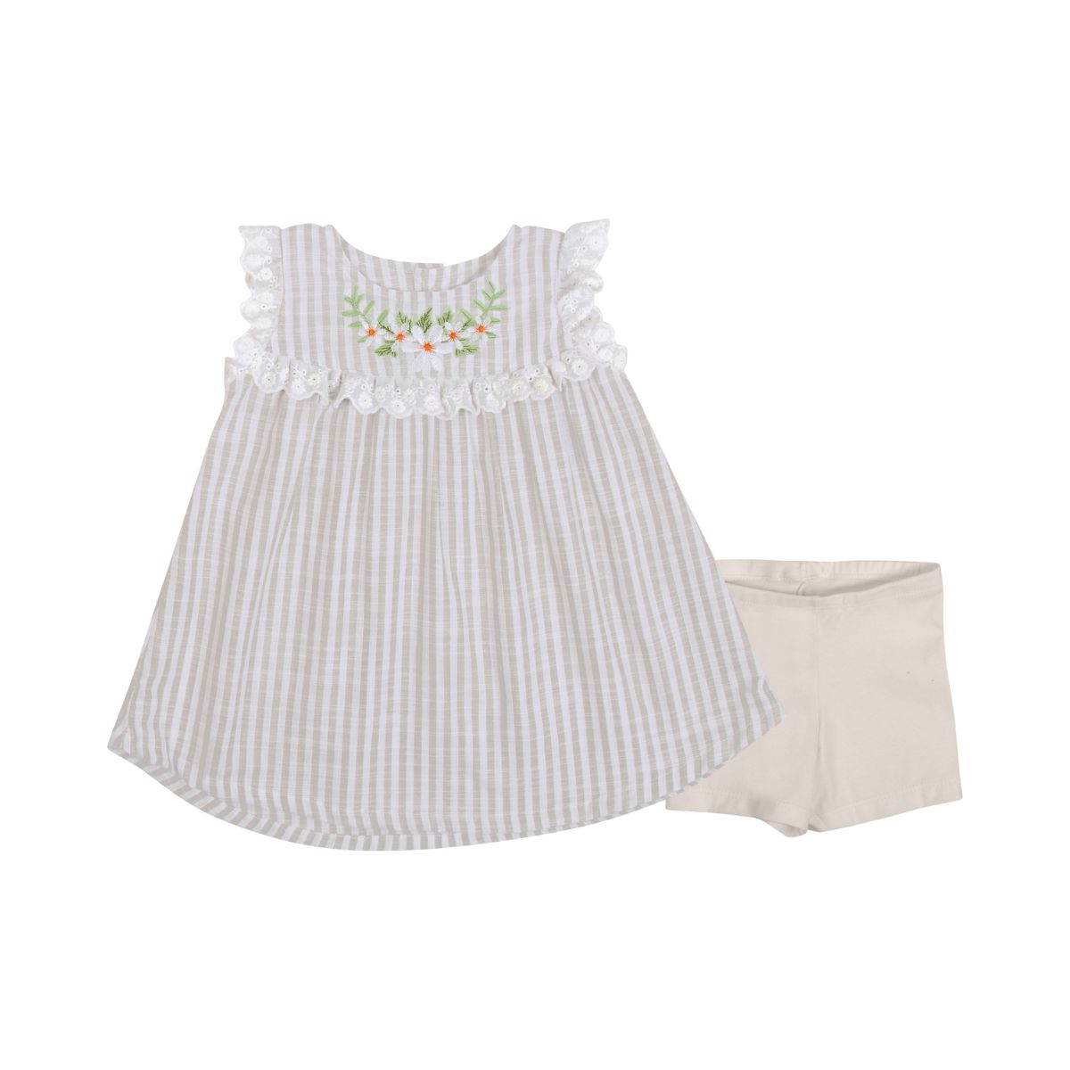 O Vestido Flor do Campo Listrado Bege com Shorts Cotton da BB Chic é a definição de delicadeza e charme para os dias mais especiais. Com estampa listrada em tom suave de bege, o modelo ganha um toque encantador com o bordado de florzinhas no peito e acabamento em renda branca nas mangas e pala.