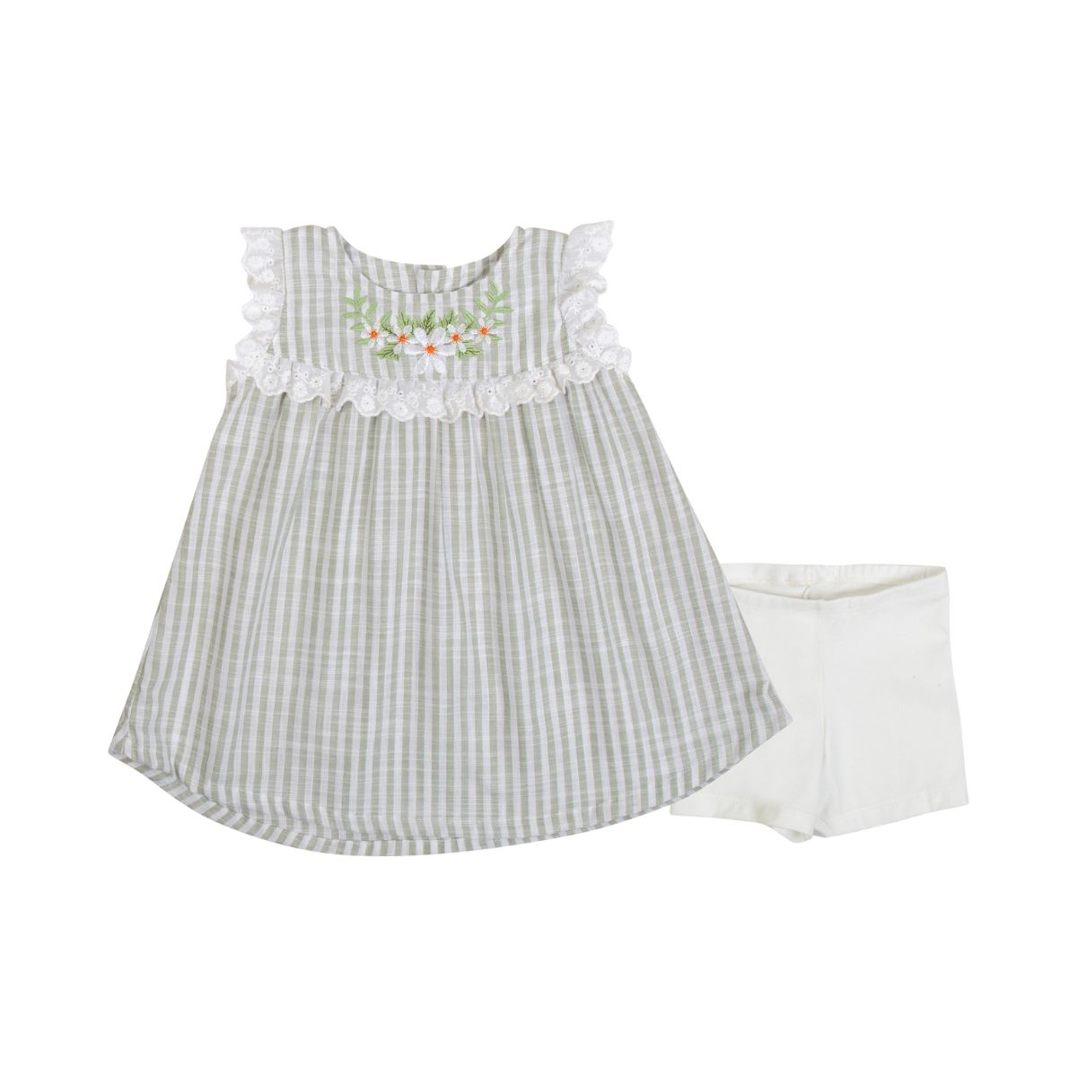 O Vestido Flor do Campo Listrado Verde com Shorts Cotton da BB Chic é a definição de delicadeza e charme para os dias mais especiais. Com estampa listrada em tom suave de verde, o modelo ganha um toque encantador com o bordado de florzinhas no peito e acabamento em renda branca nas mangas e pala.
