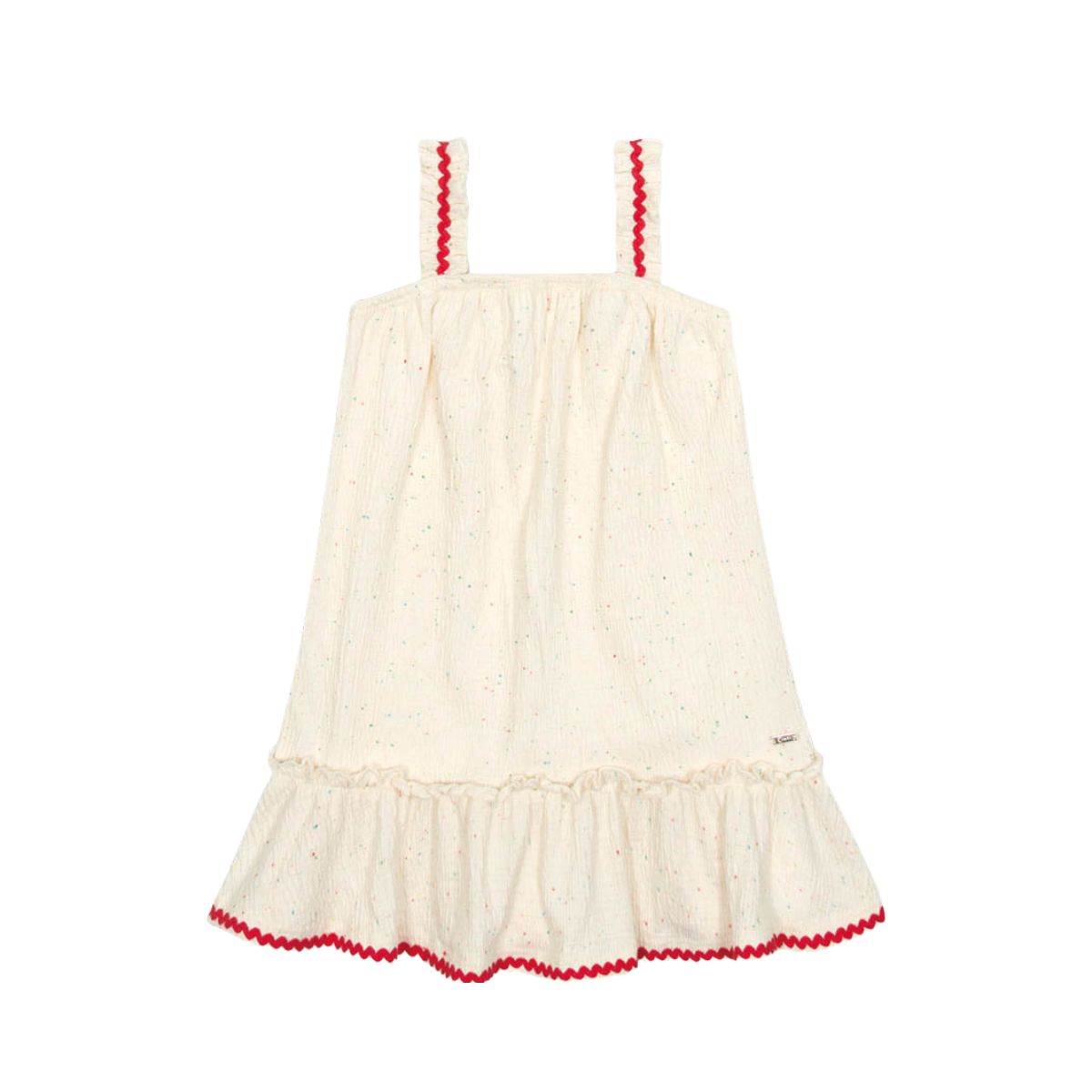 As alças com detalhe ondulado dão um charme especial ao look, trazendo um toque lúdico que as meninas adoram. Já o acabamento em fru-fru vermelho nas barras deixa a peça moderna, alegre e com aquele destaque que transforma o visual.