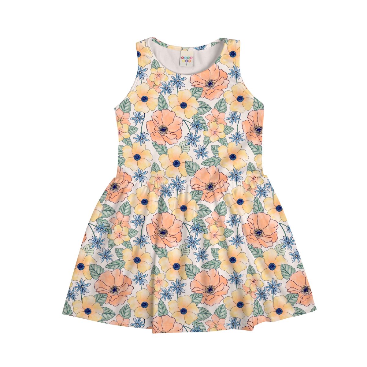 Disponível nas cores rosa e laranja, traz estampas divertidas e delicadas com cores vivas que não desbotam facilmente. A modelagem regata e a saia com ótimo caimento garantem frescor e movimento.